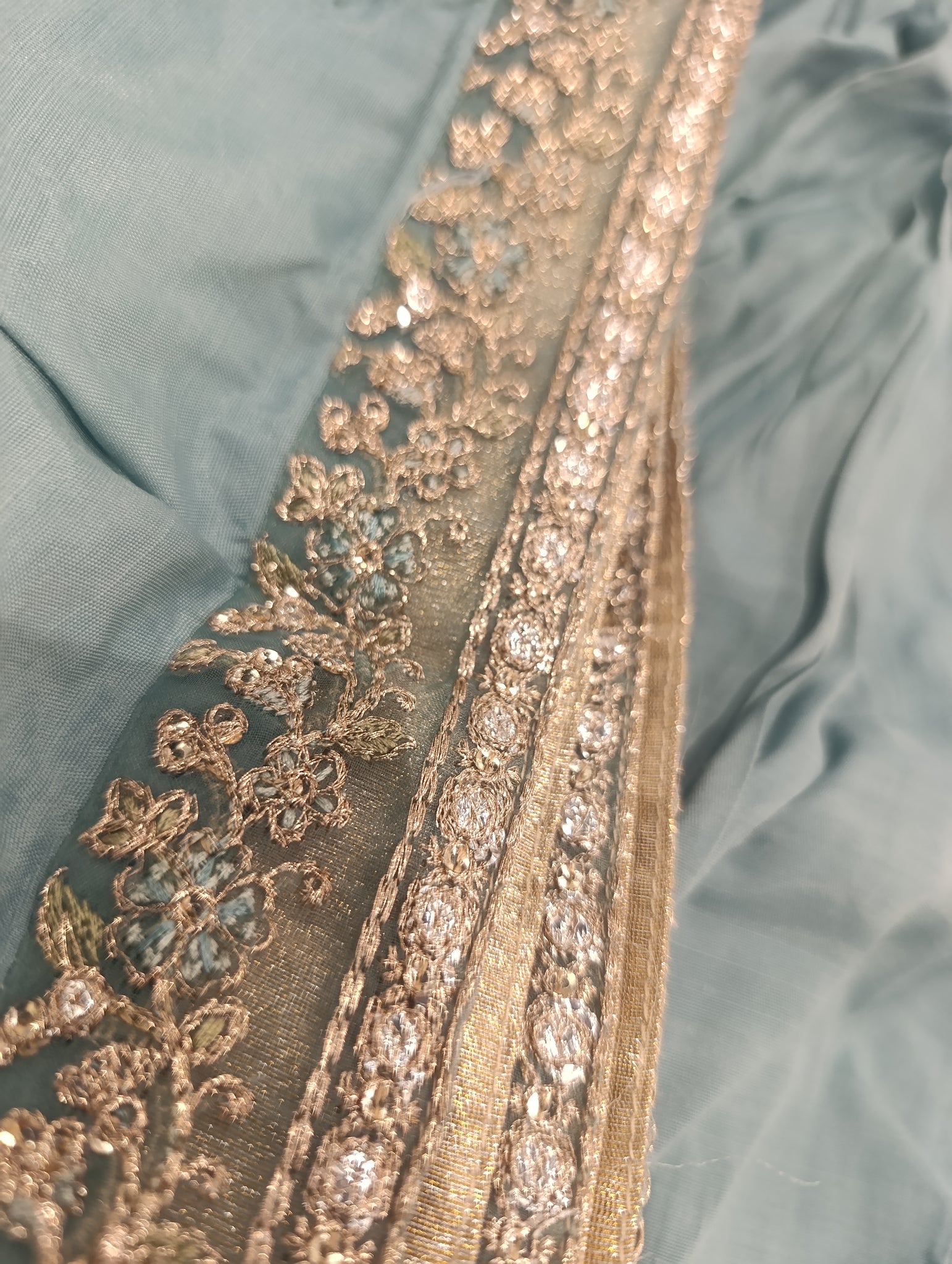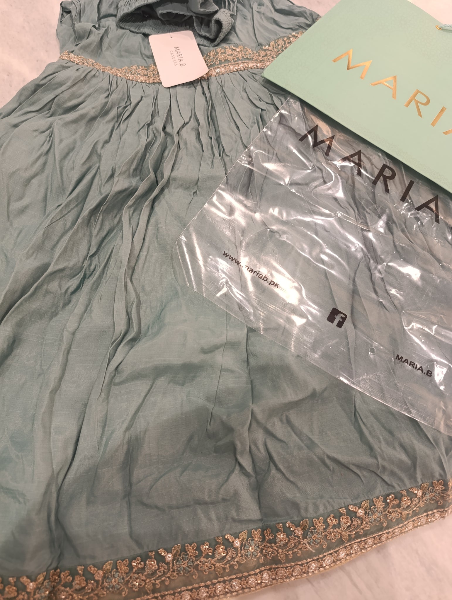 Gharara is stitched with Raw silk fabric.Fully golden tilla embroidered with golden sequins embellishments patches on the flair of the Gharara and on the knee joint too. Golden tissue fabric is stitched at the back side of the patching on the flair of the Gharara.