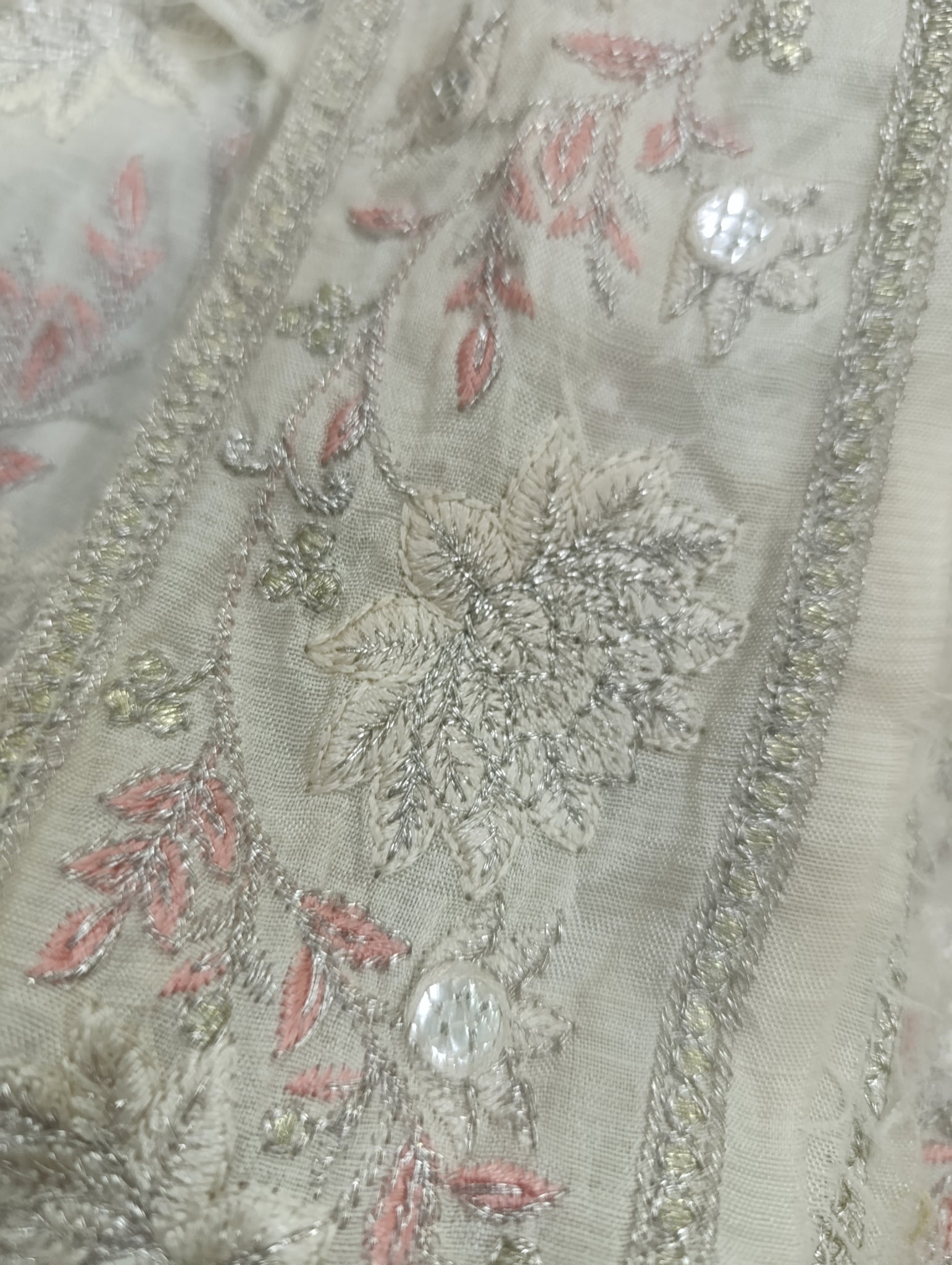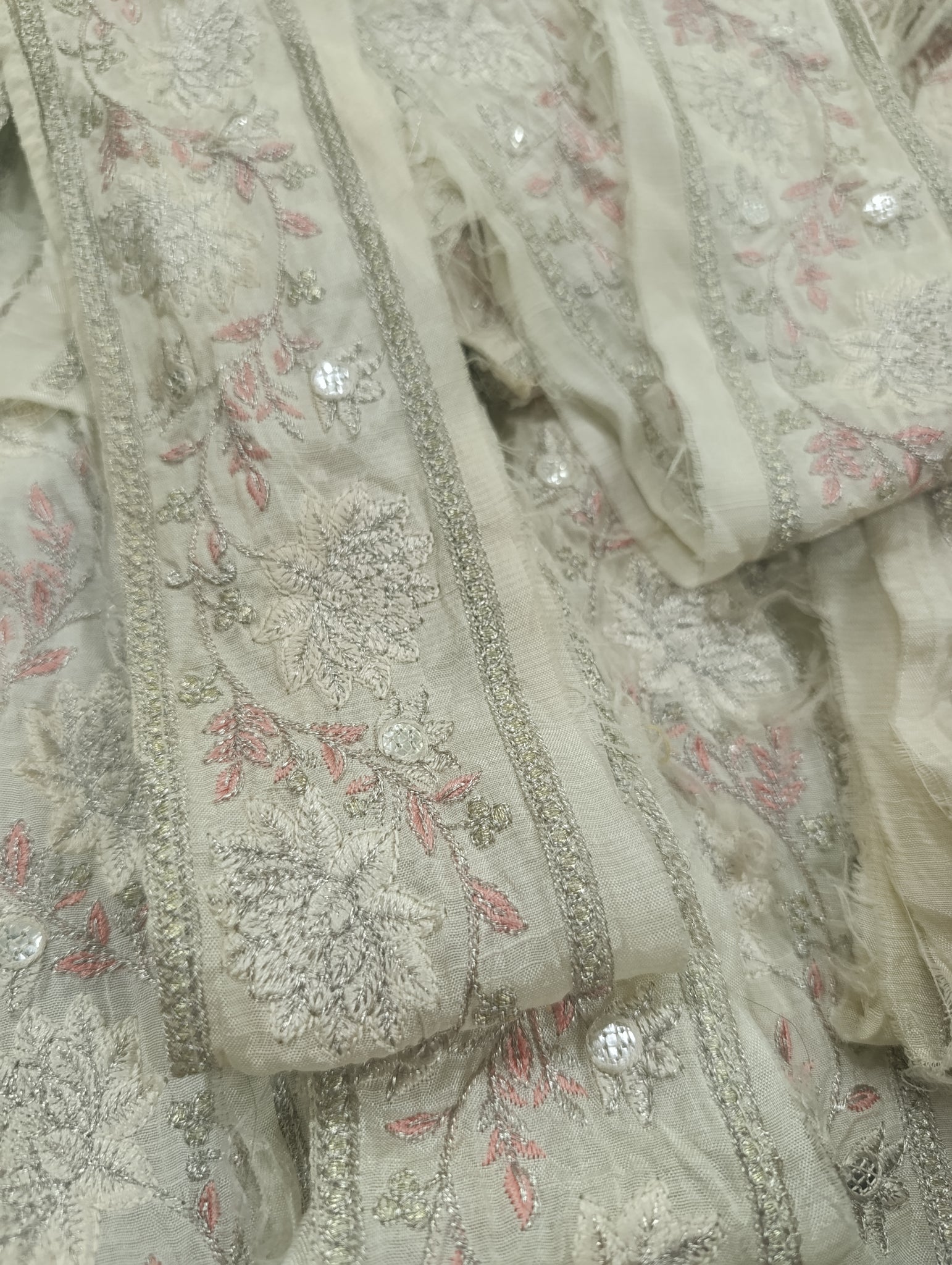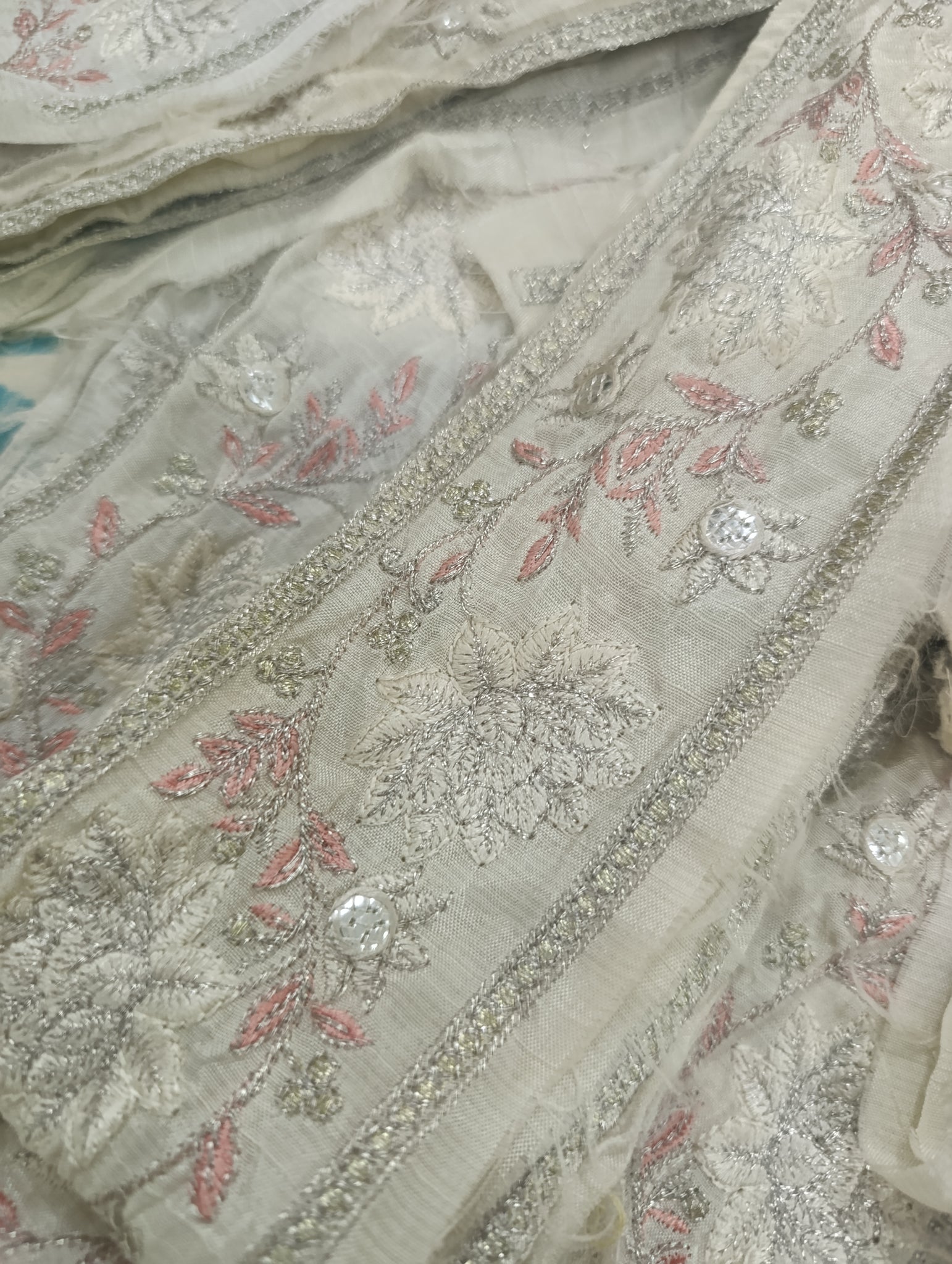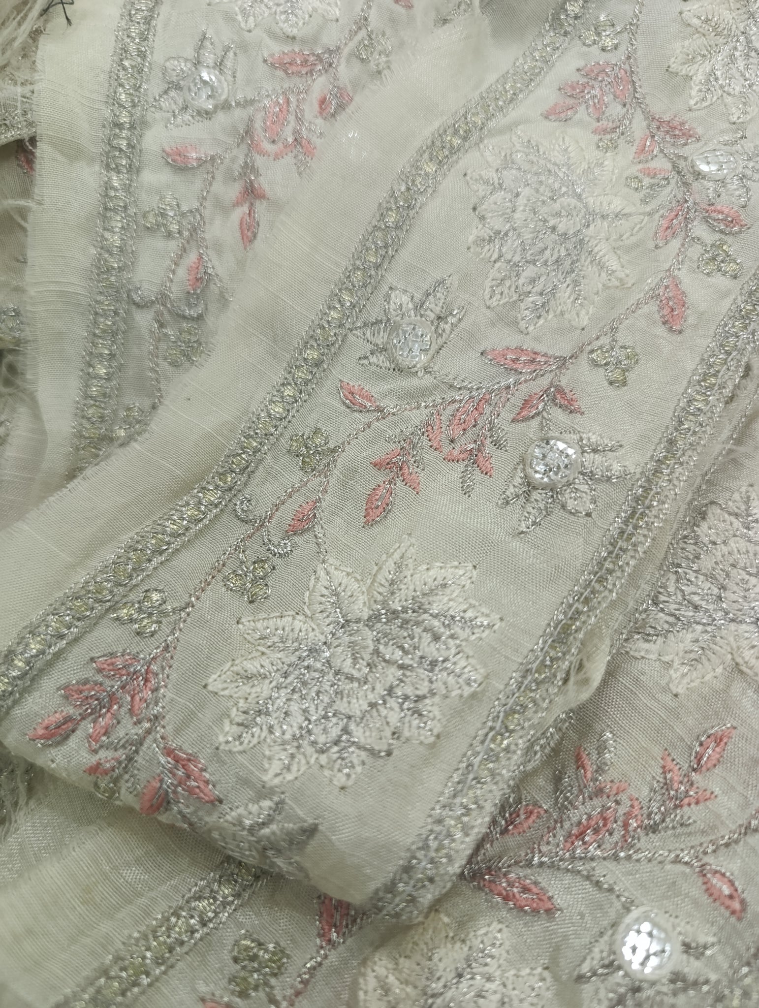 Heavily copper gold tilla embroidered with red sequins embellishments two sided border. Fully squined jall in the center on raw silk fabric.