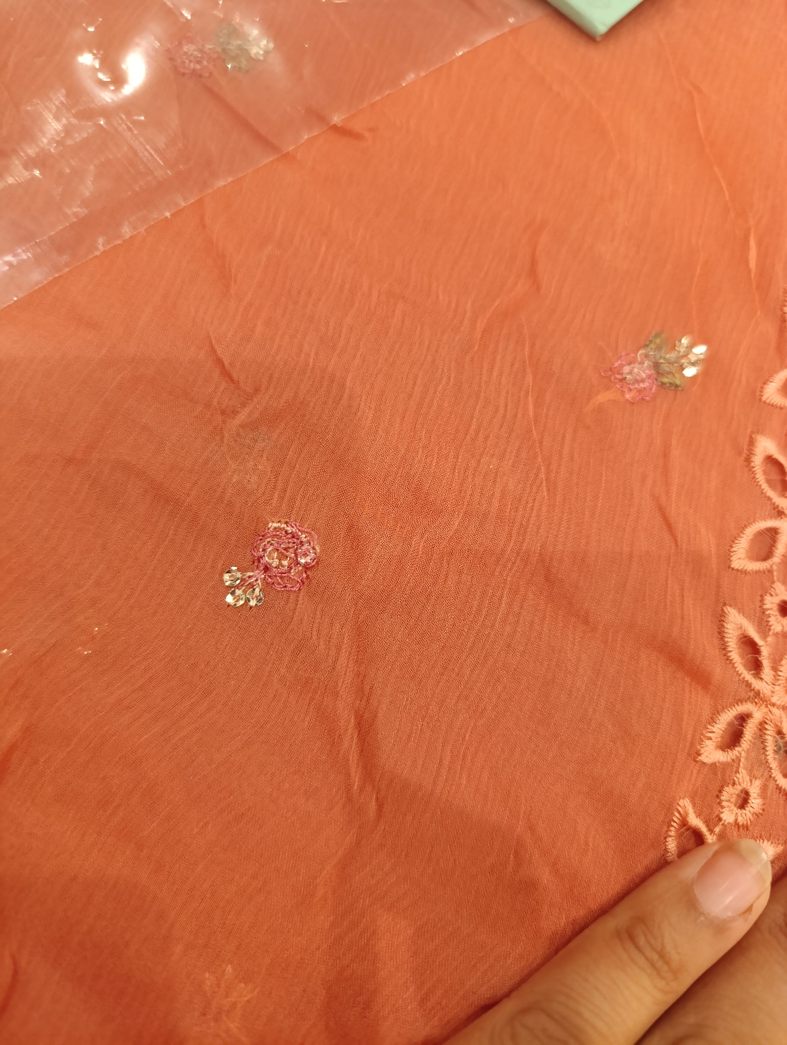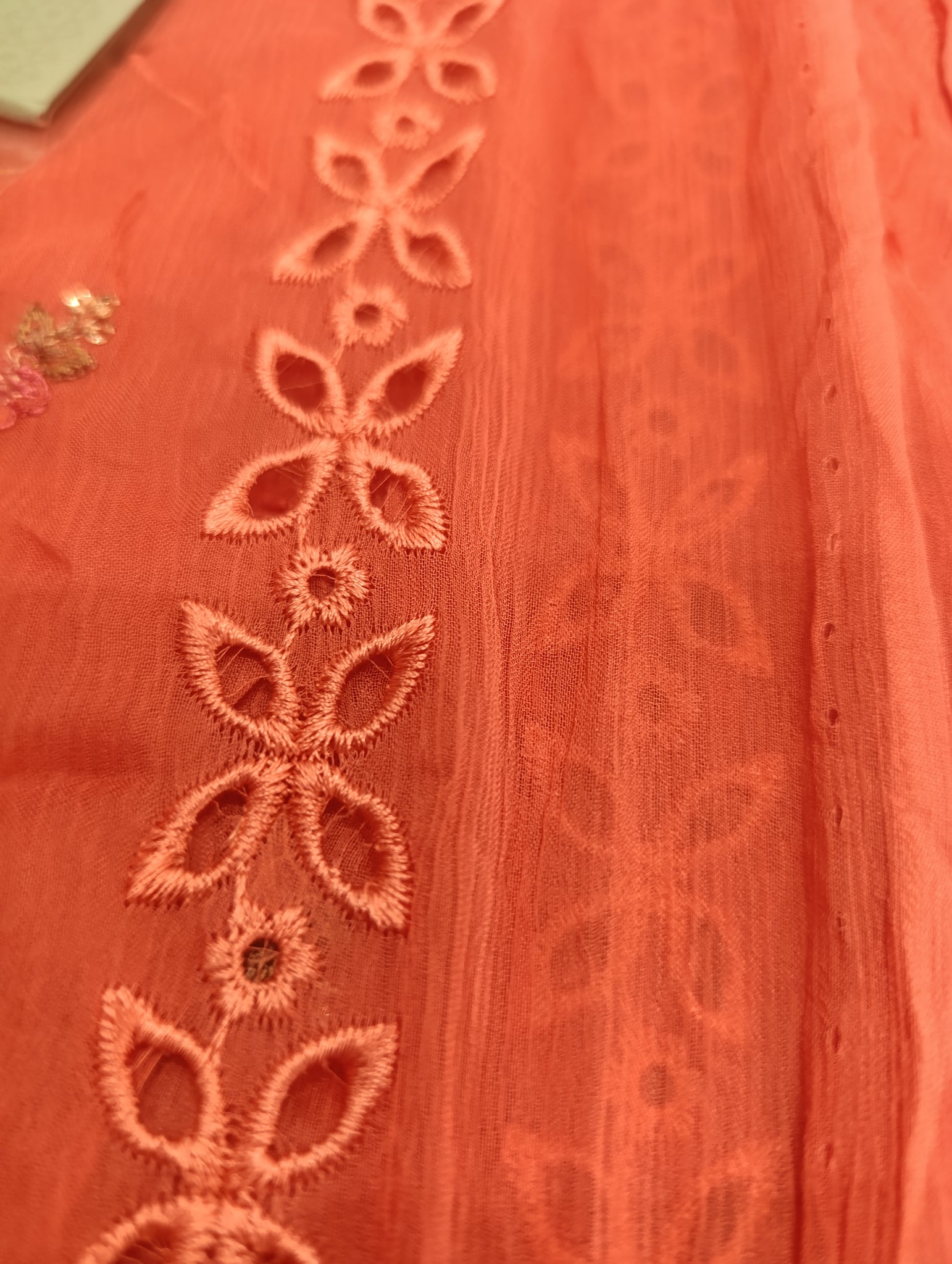 Heavily thread embroidered in Schiffli or chicken kari style with lightest golden squins Embellishment.