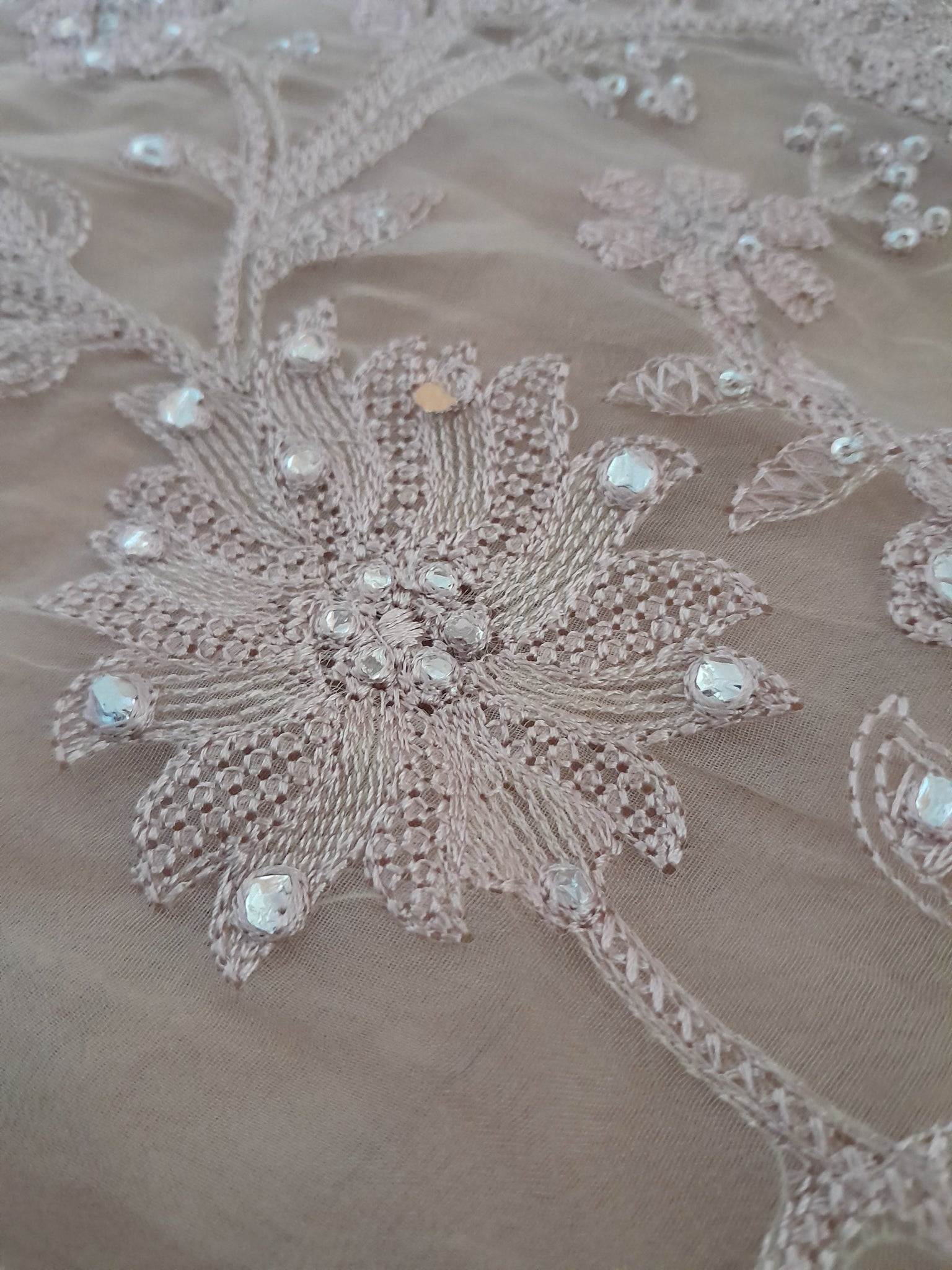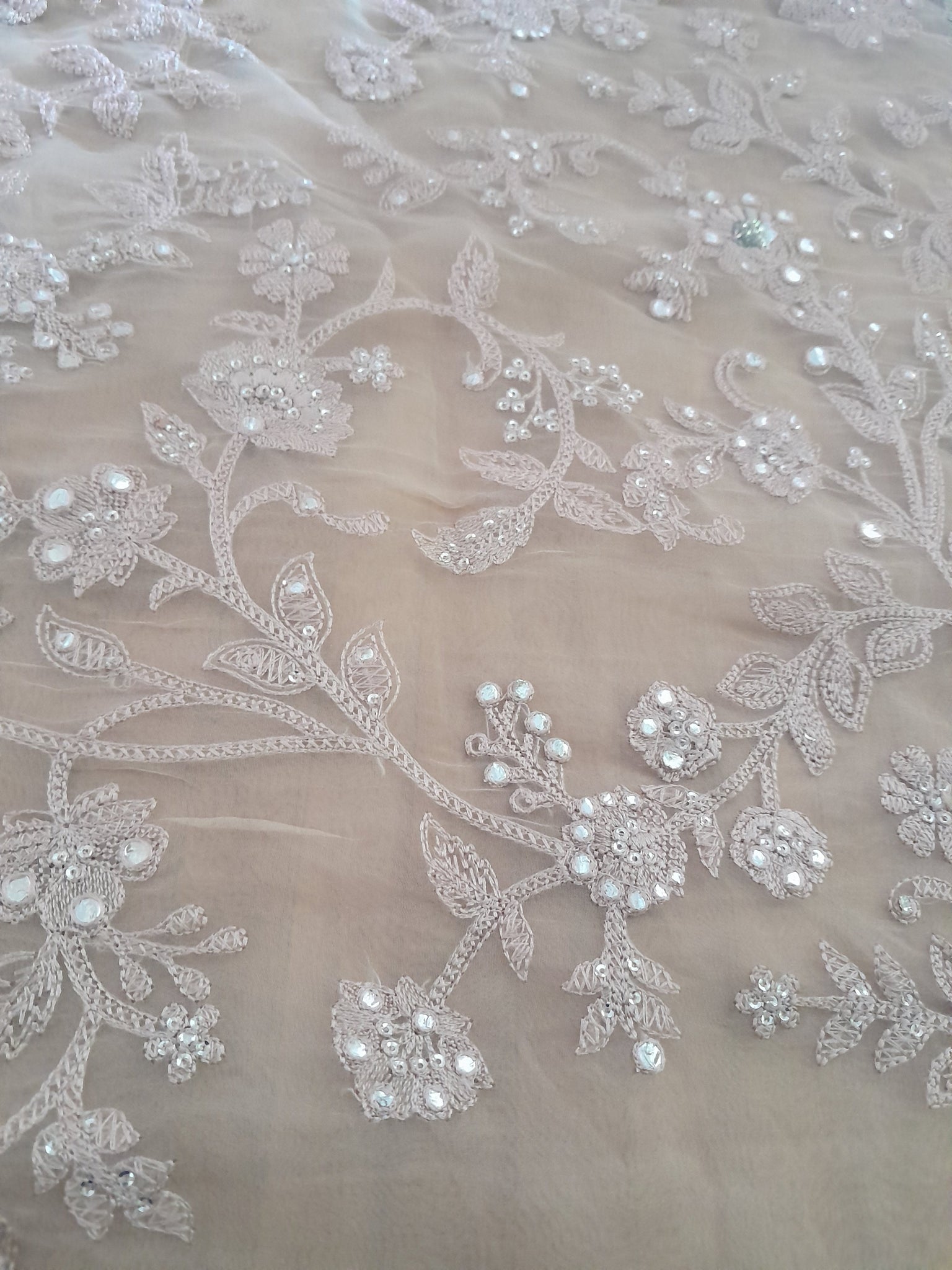 Heavily thread embroidered with silver sequins and foil work embellishments on three different designs Fabric separately.