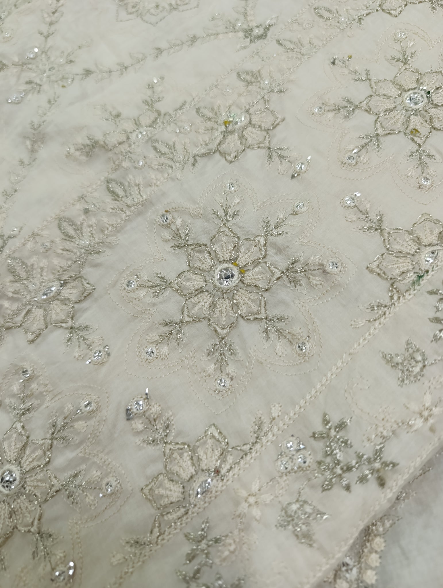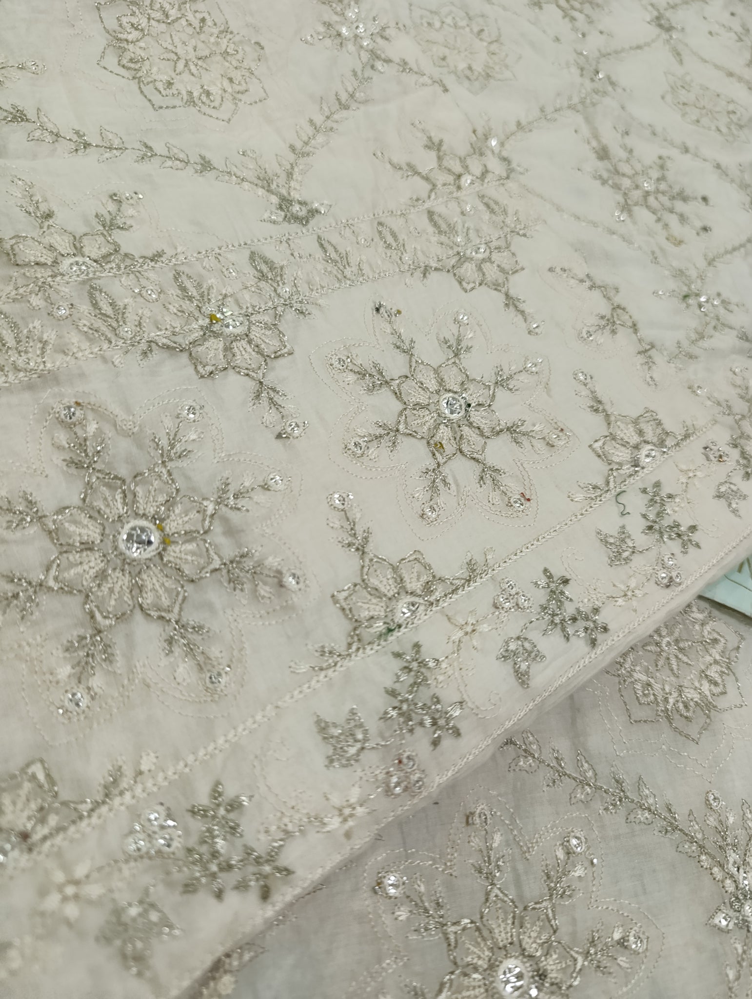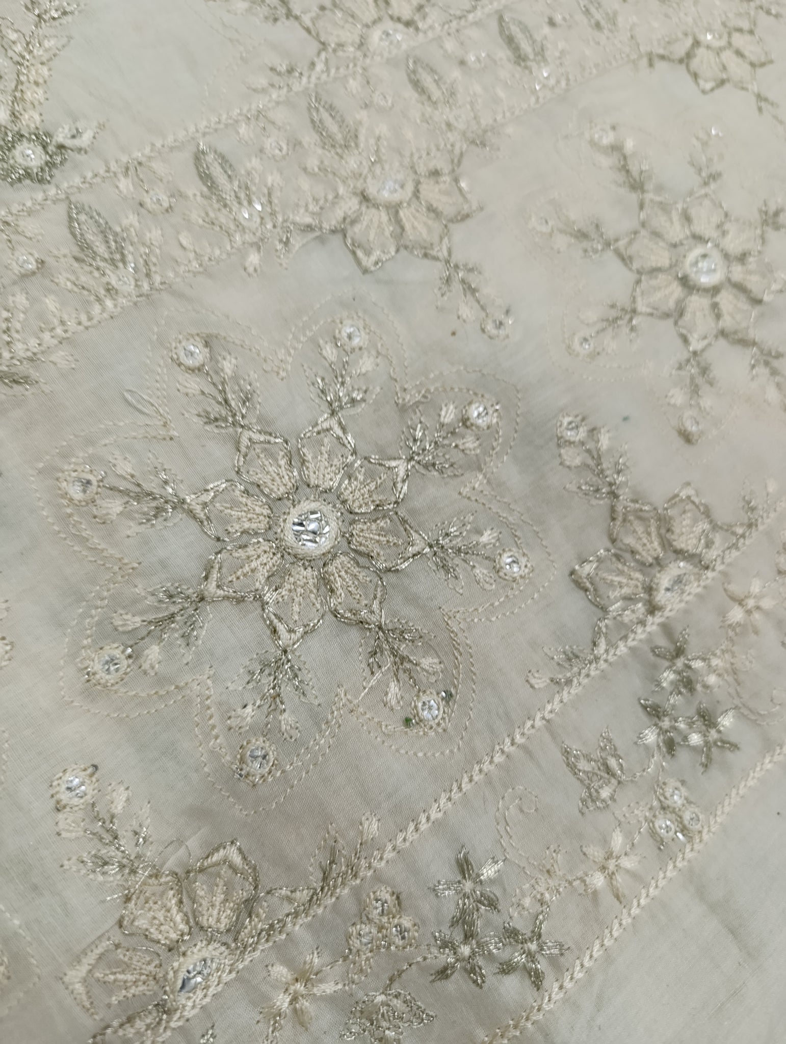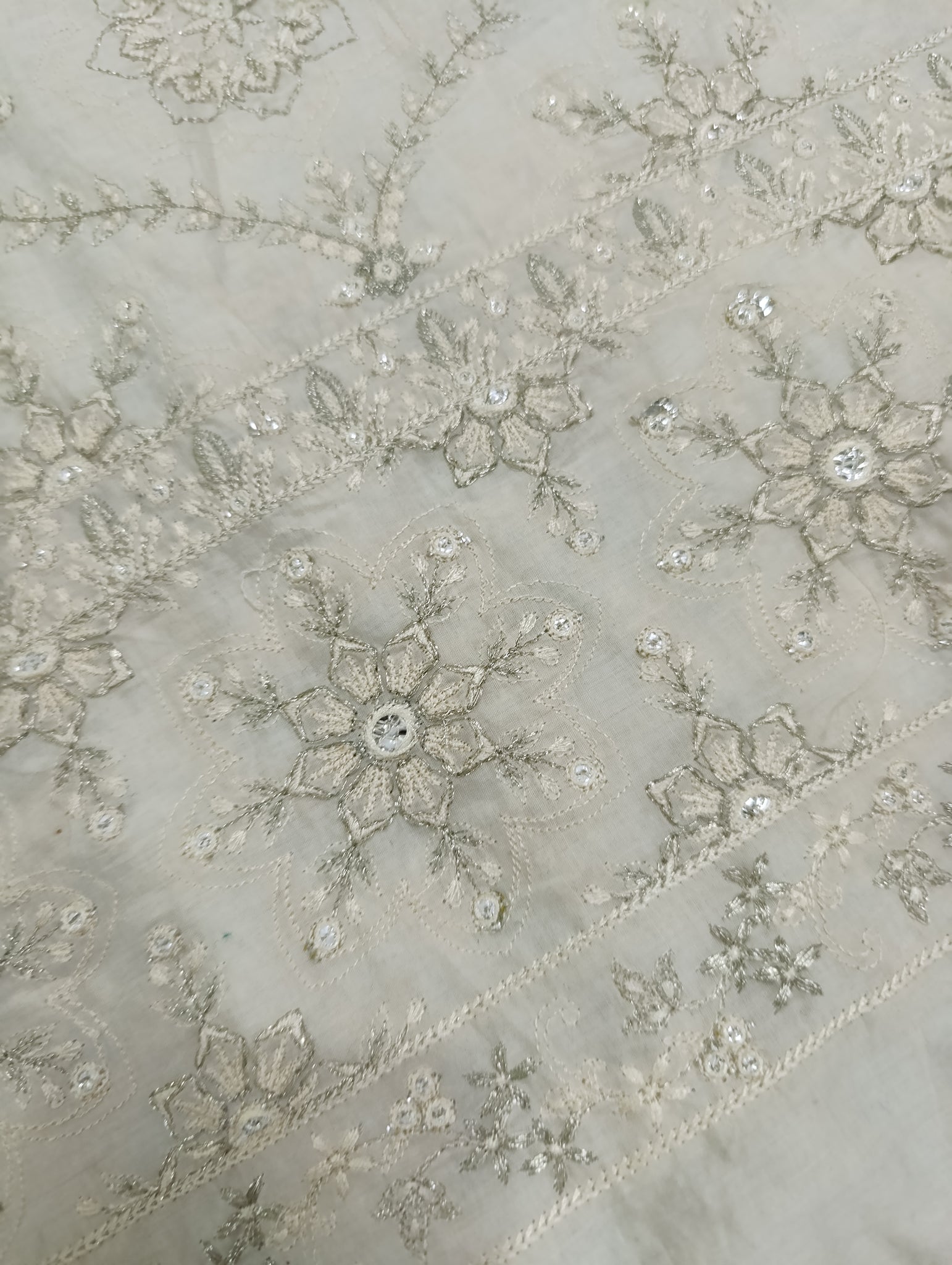 Heavily thread and copper silver tilla embroidered with silver foil work embellishments.