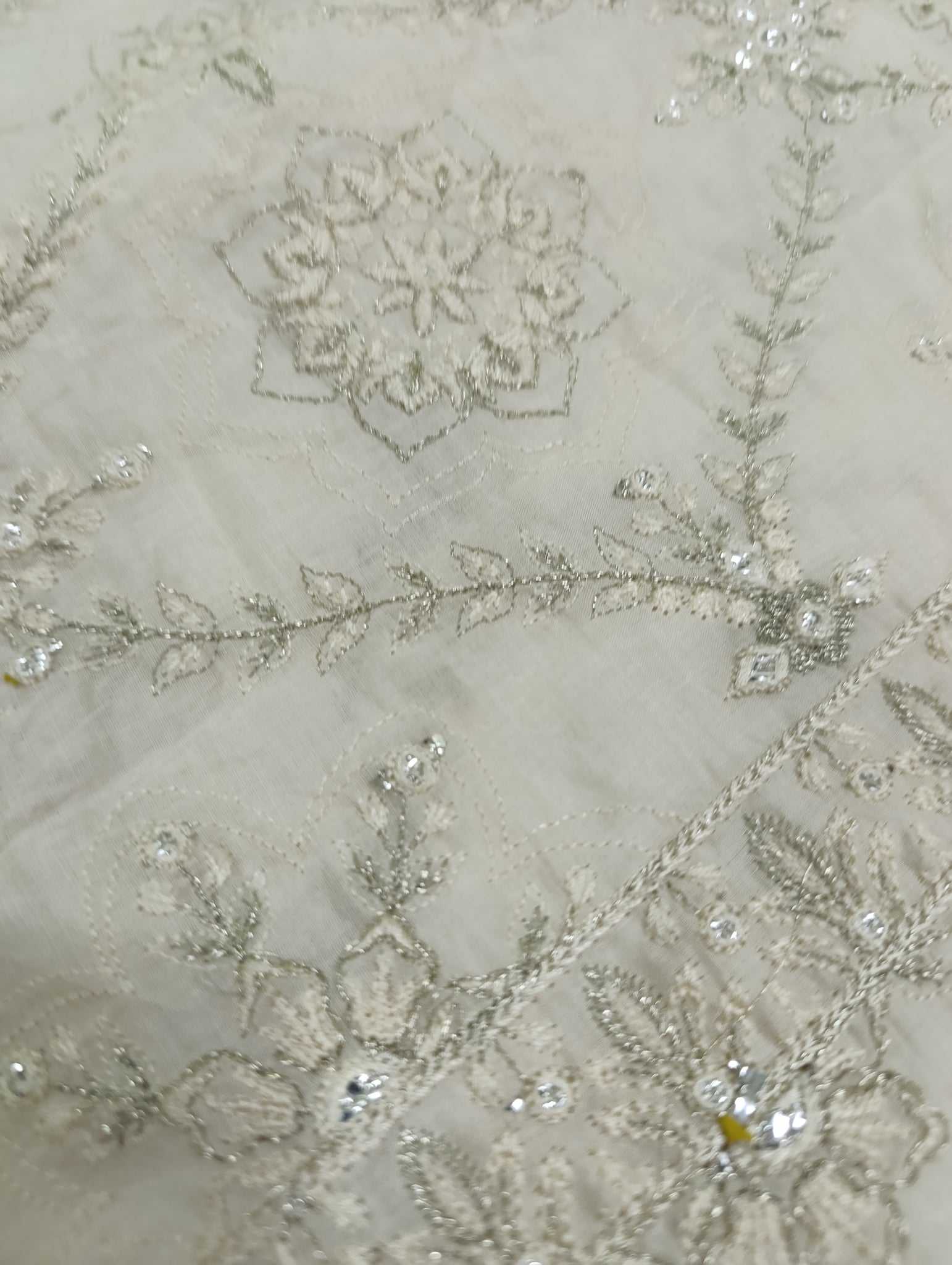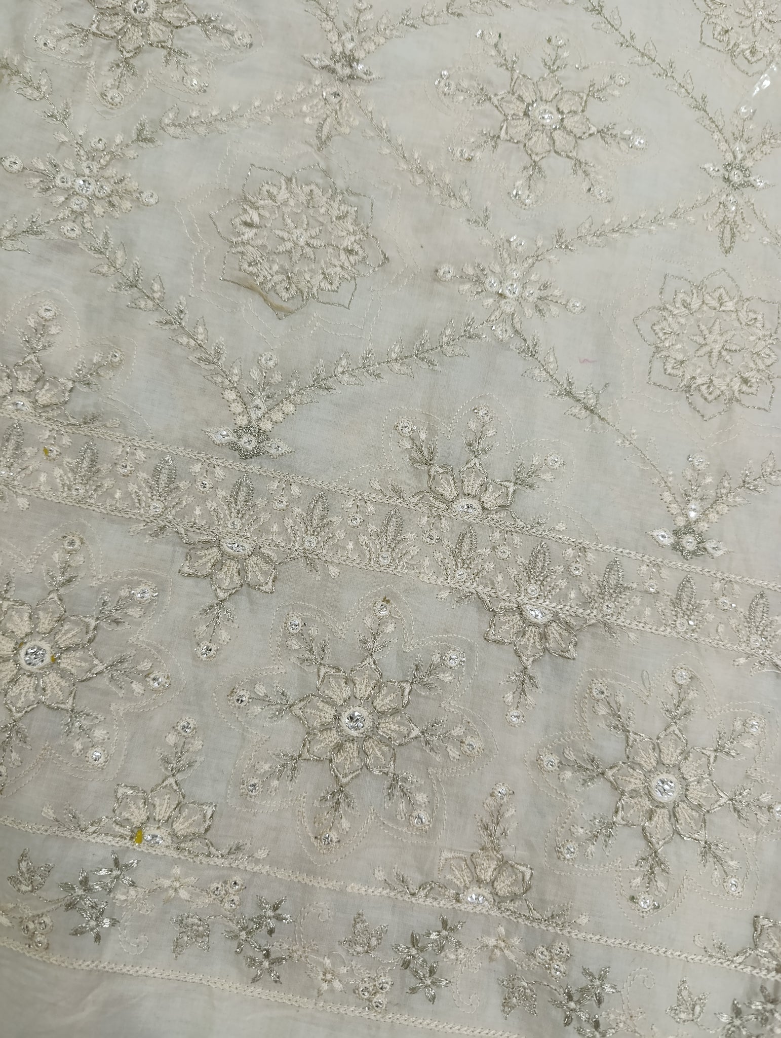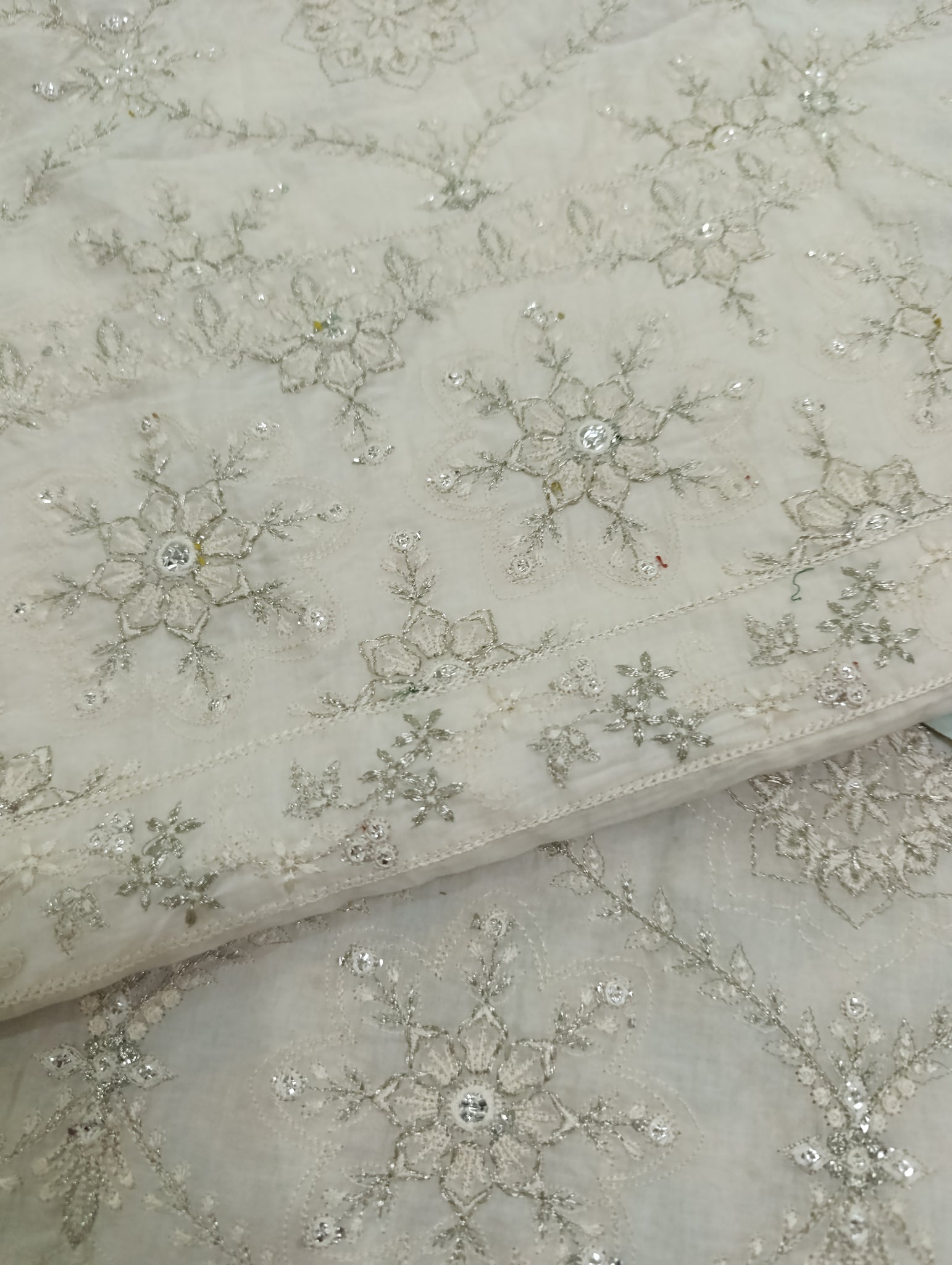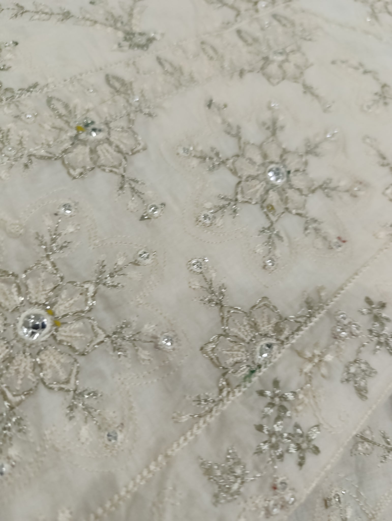 Heavily thread and copper silver tilla embroidered with silver foil work embellishments.