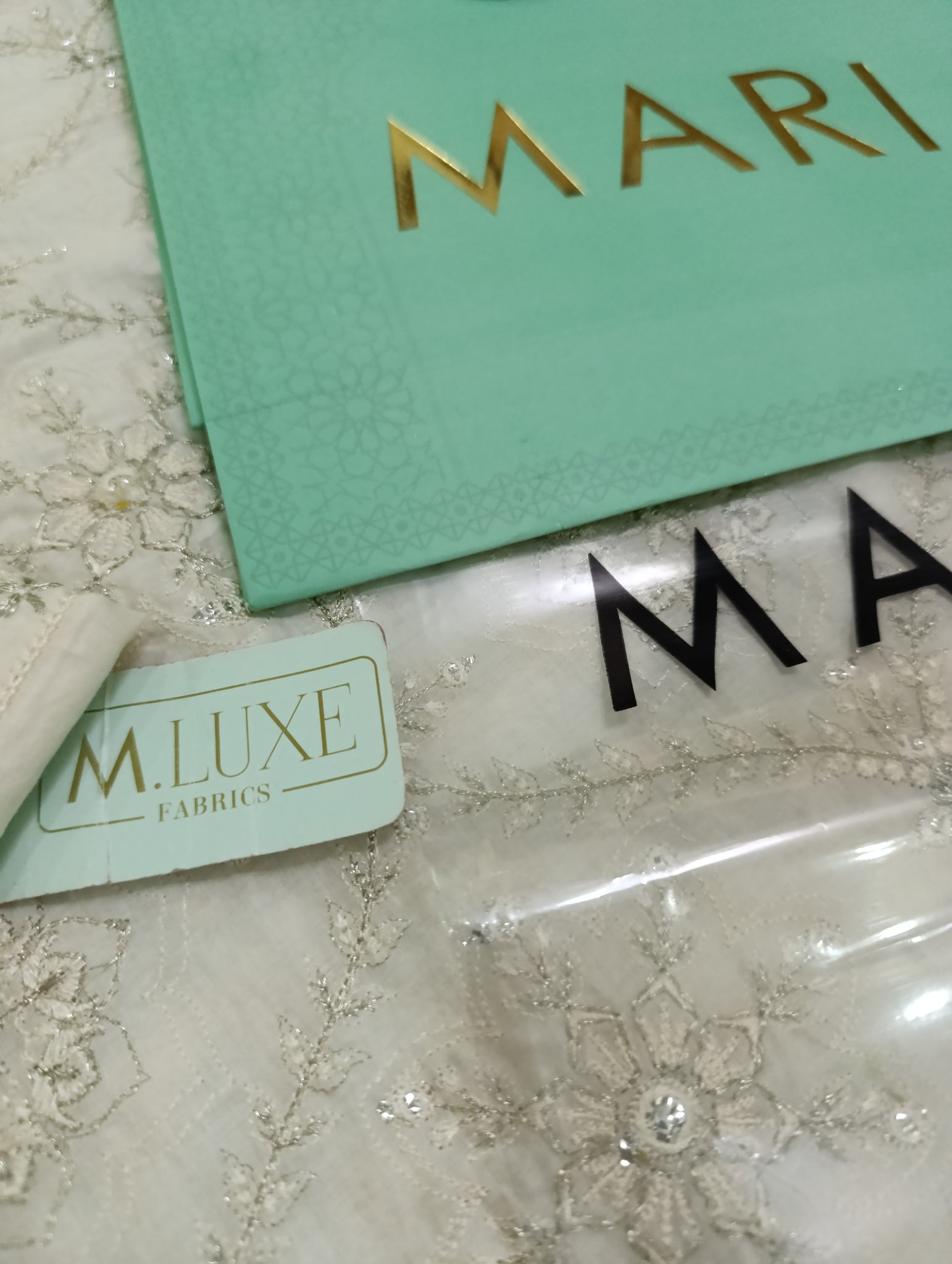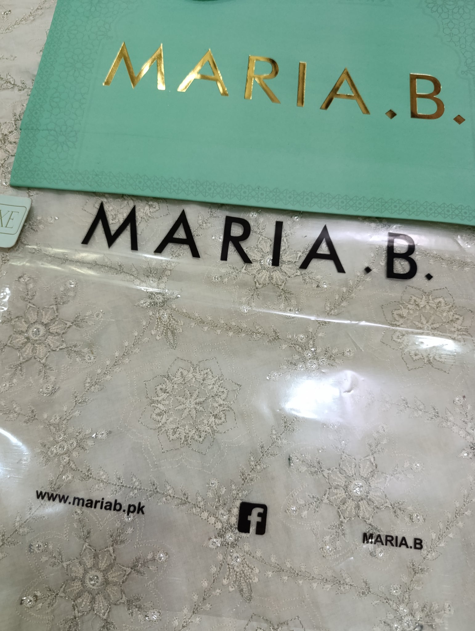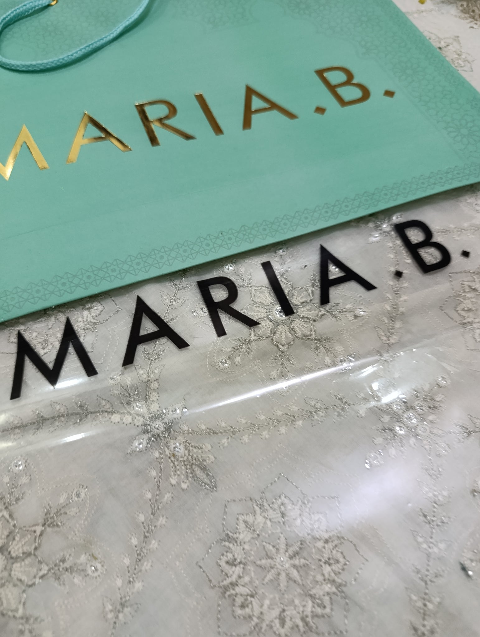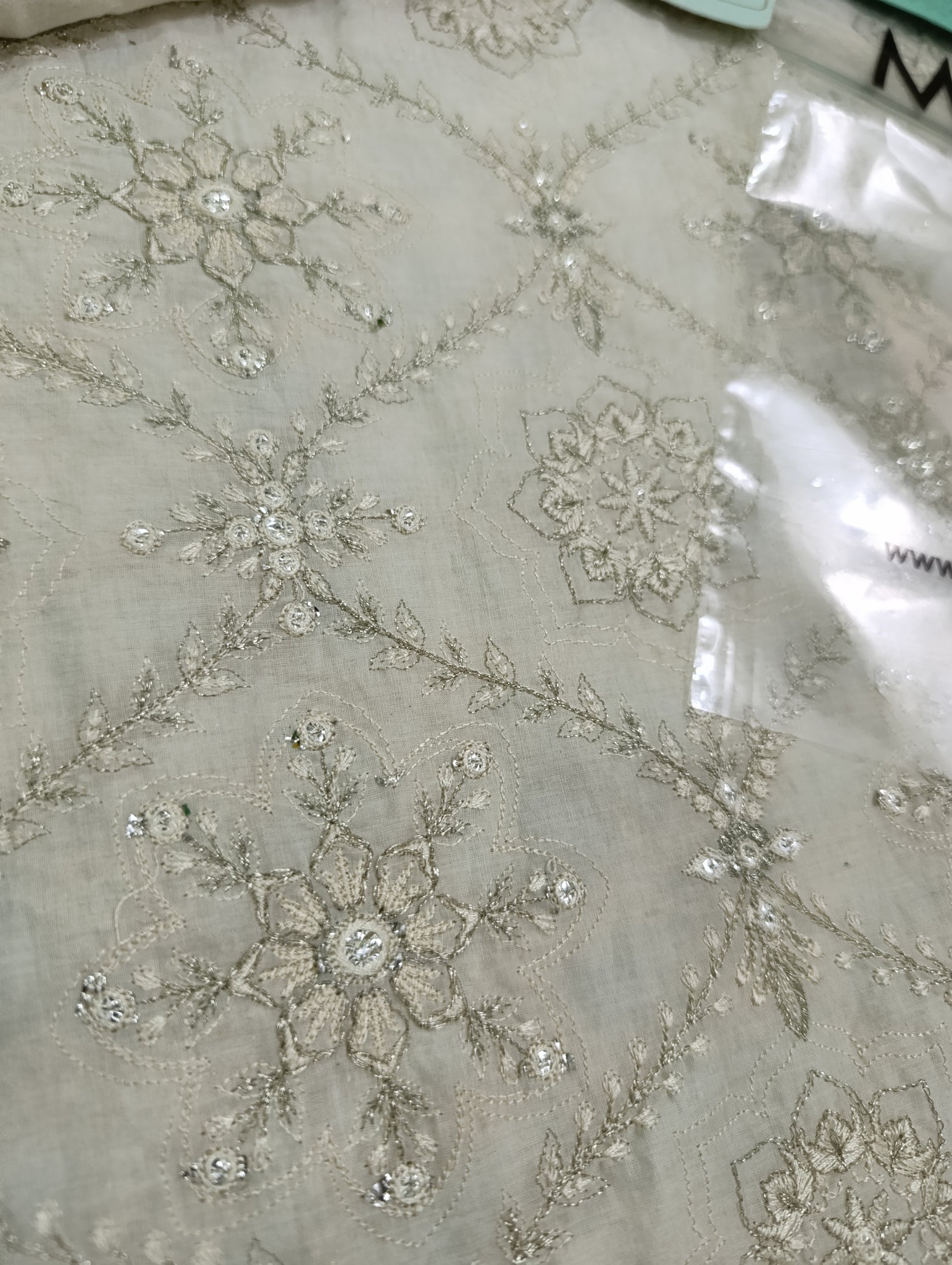 Heavily thread and copper silver tilla embroidered with silver foil work embellishments.