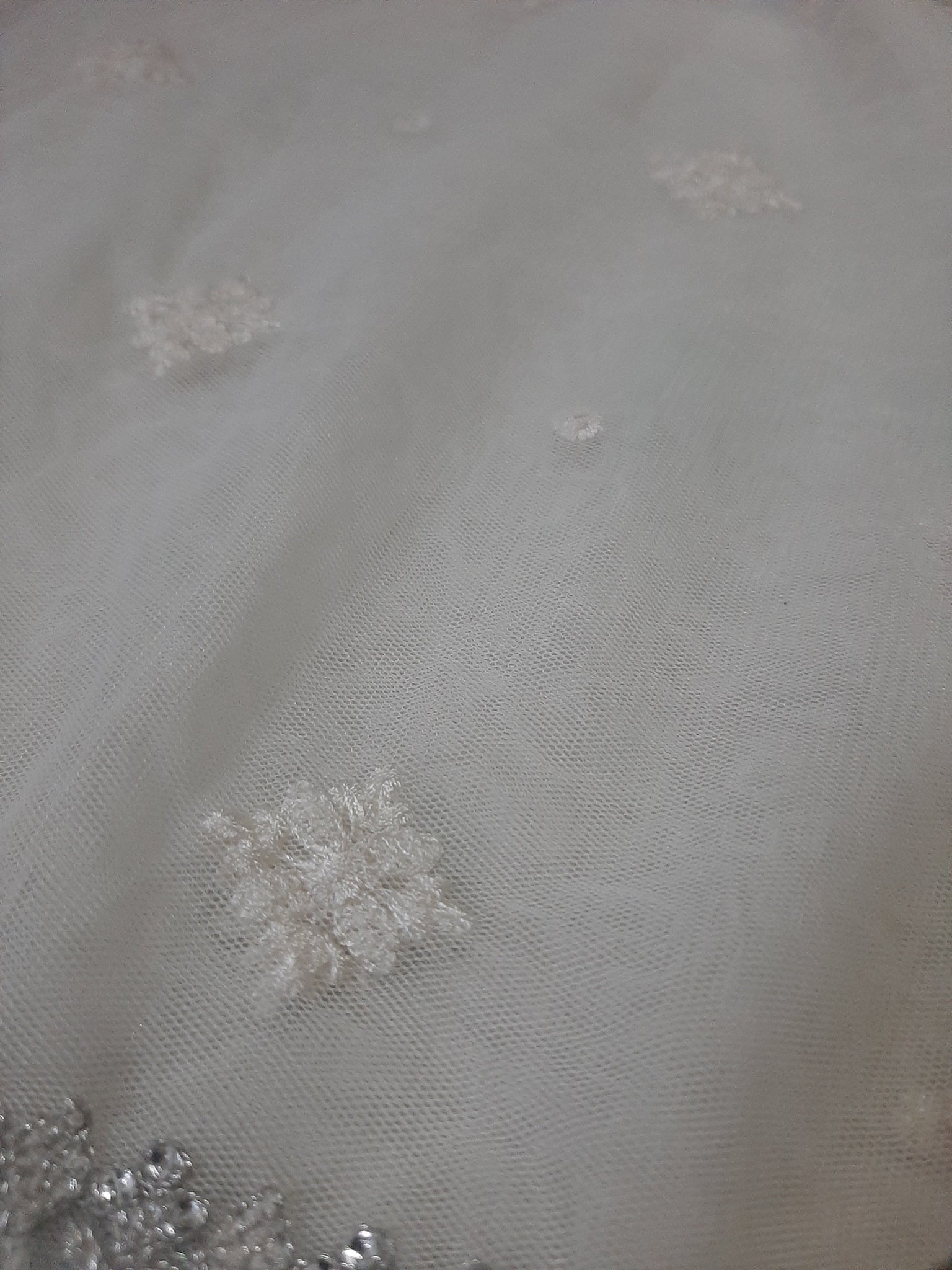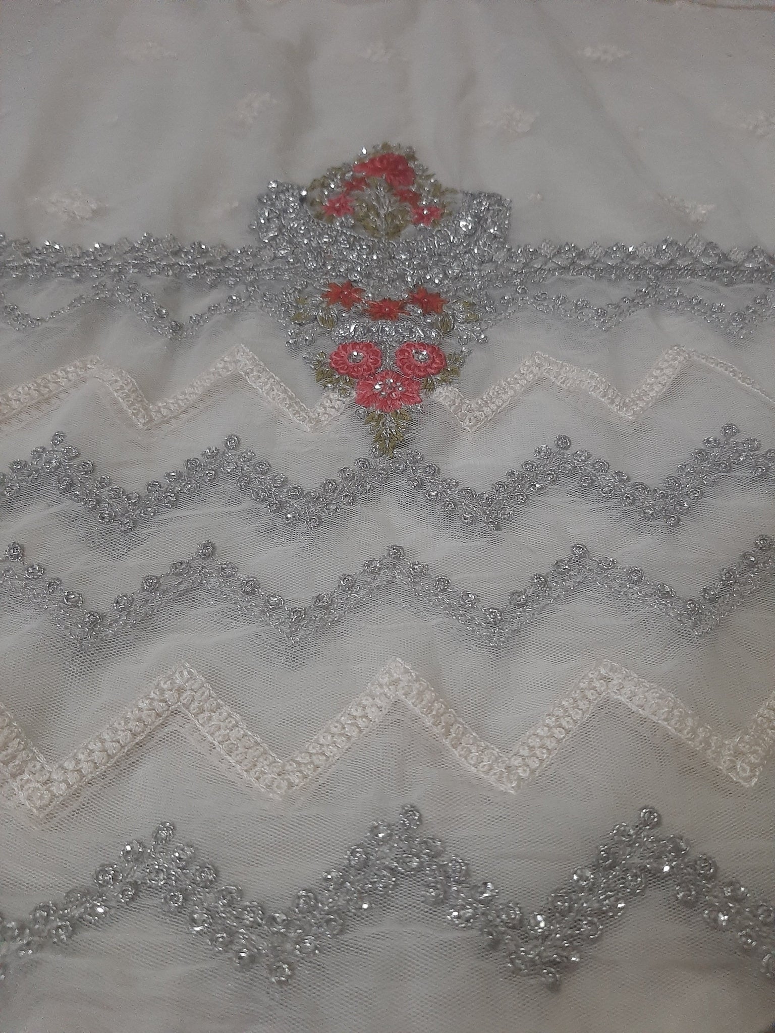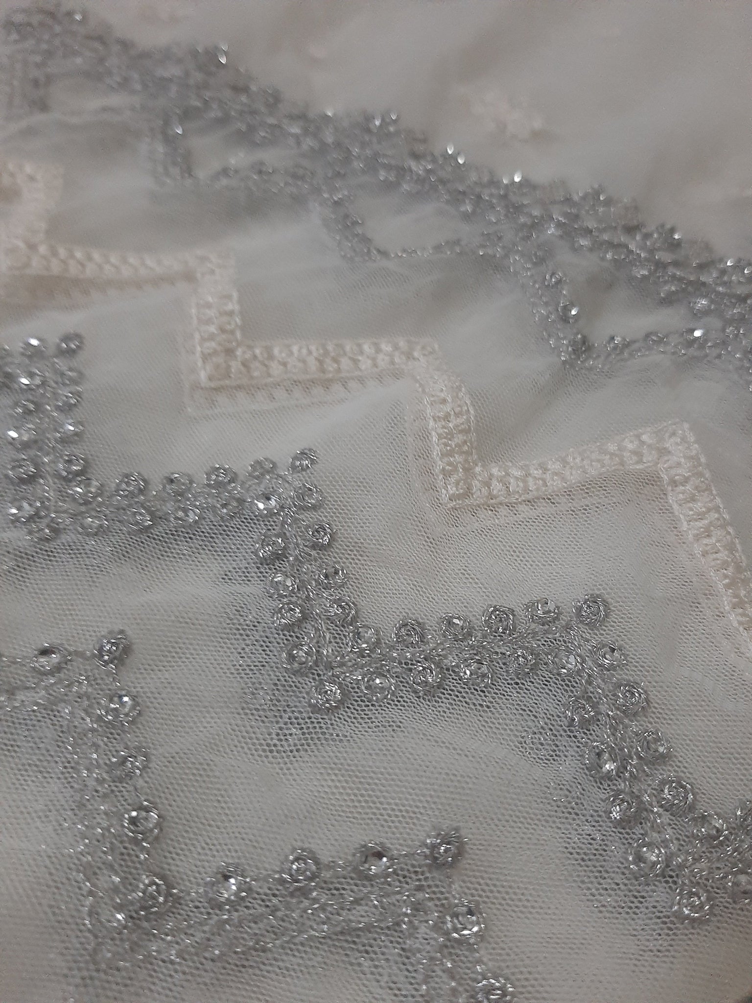 Fully thread and silver tilla embroidered with silver sequins embellishment and foil work.
