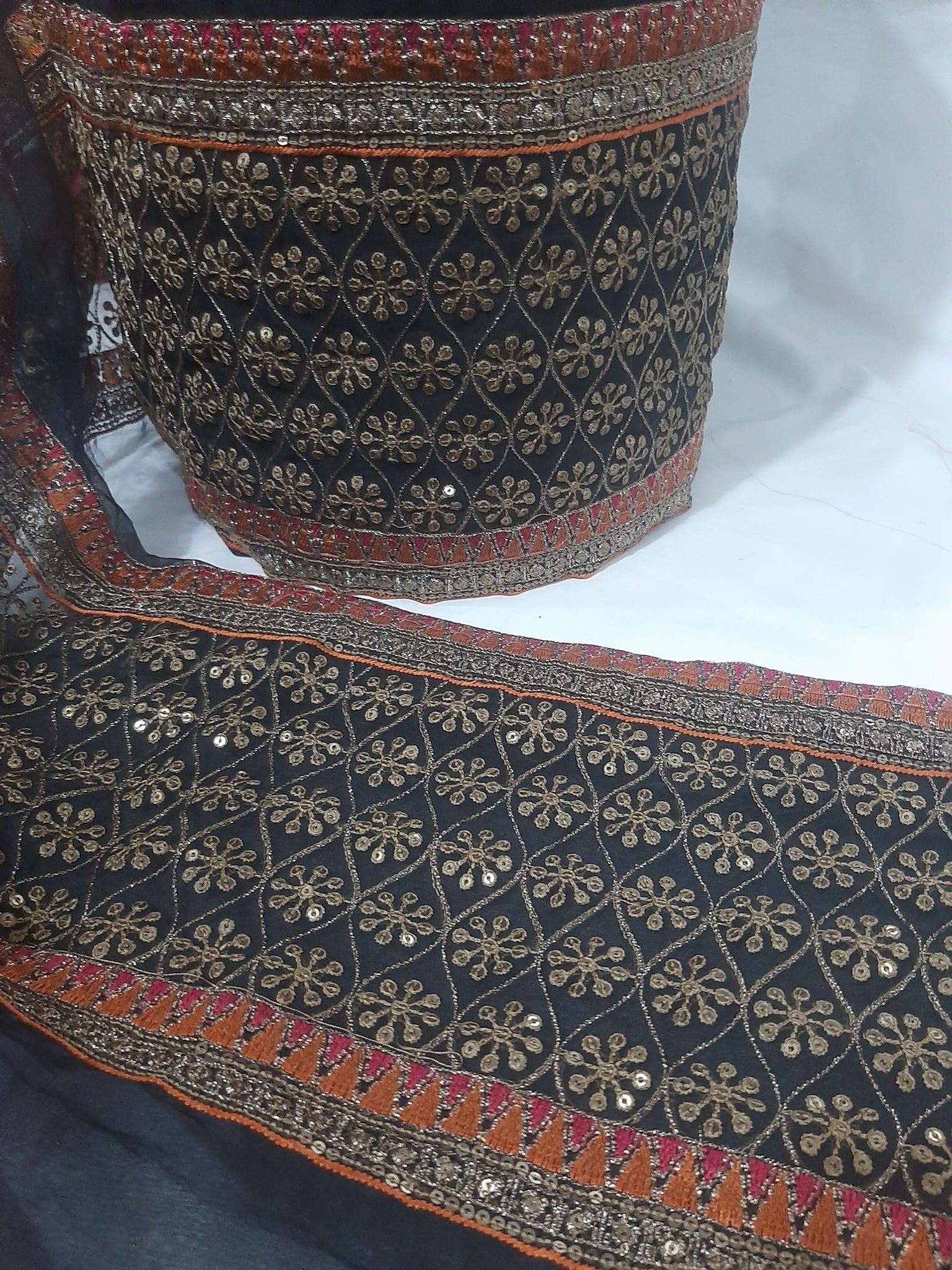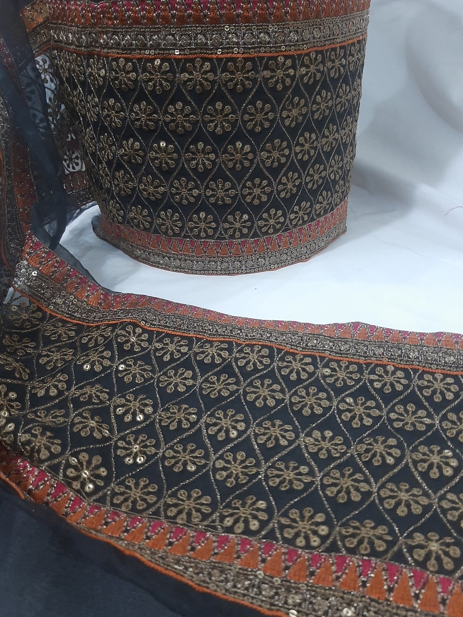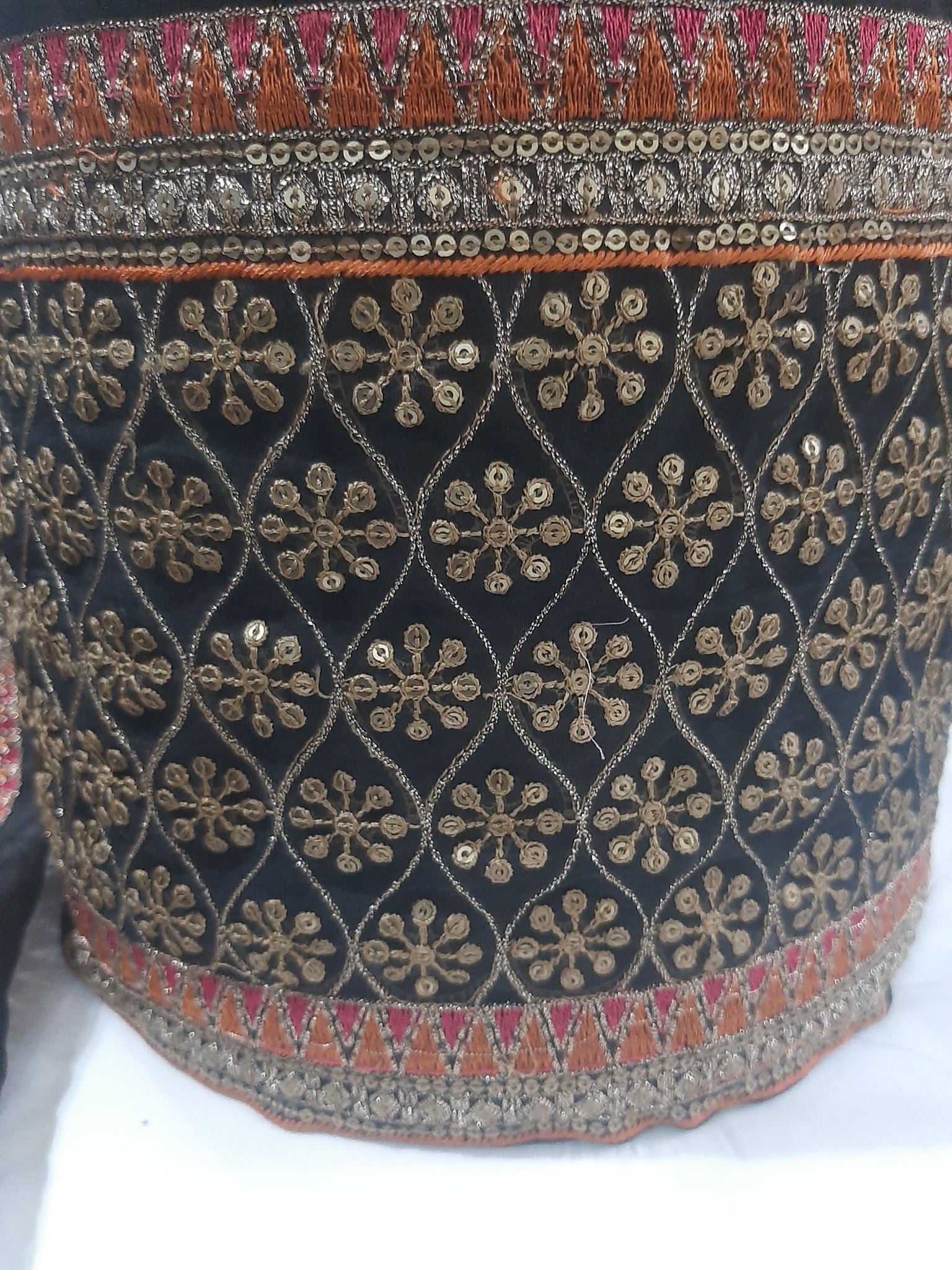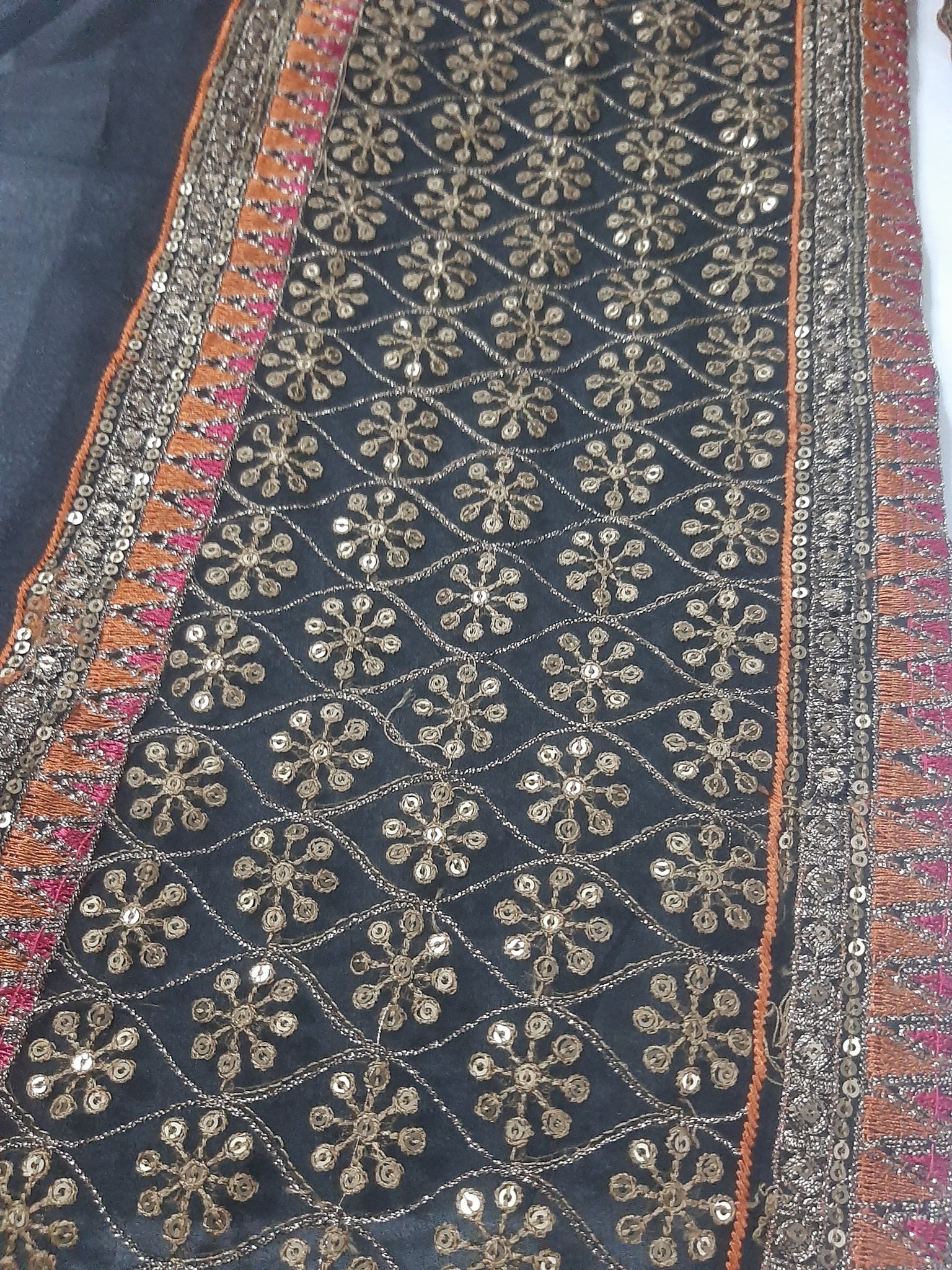 Fully thread and tilla embroidered with glittery sequins embellishments and foil work.