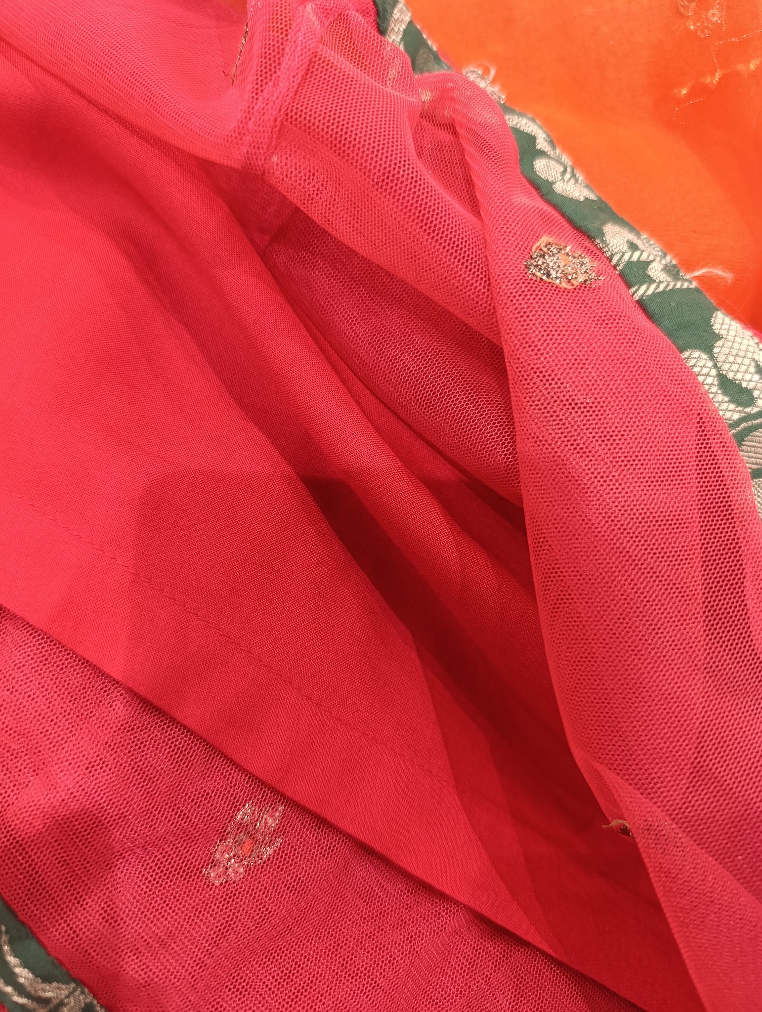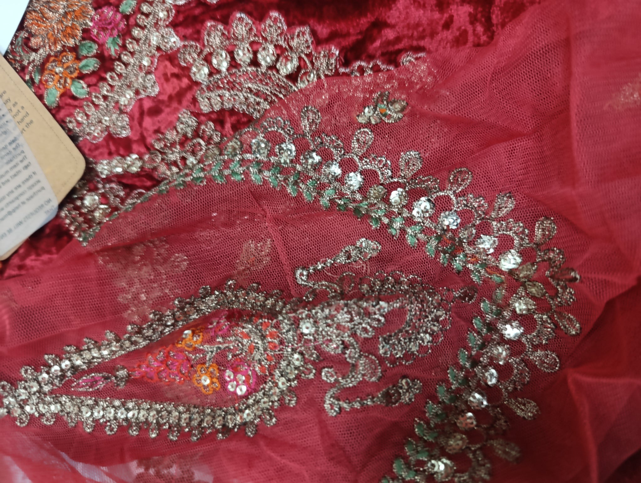 Duppta is on organza fabric with four sided embroidered border embellished with gotta kinari and regular motives overall.